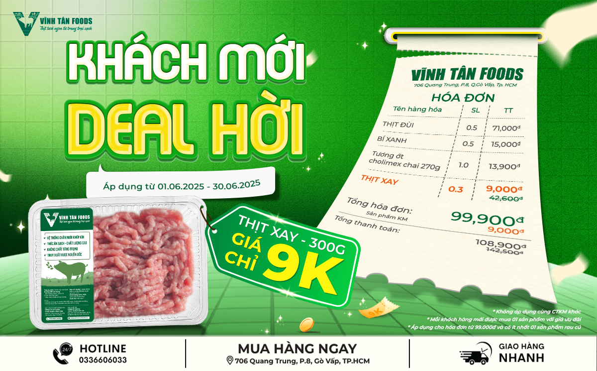 👉 Chớp ngay cơ hội trải nghiệm thịt sạch với chiếc deal thịt xay siêu hời - giá sốc chỉ 9K/300g khi mua hóa đơn từ 99K kèm rau củ.