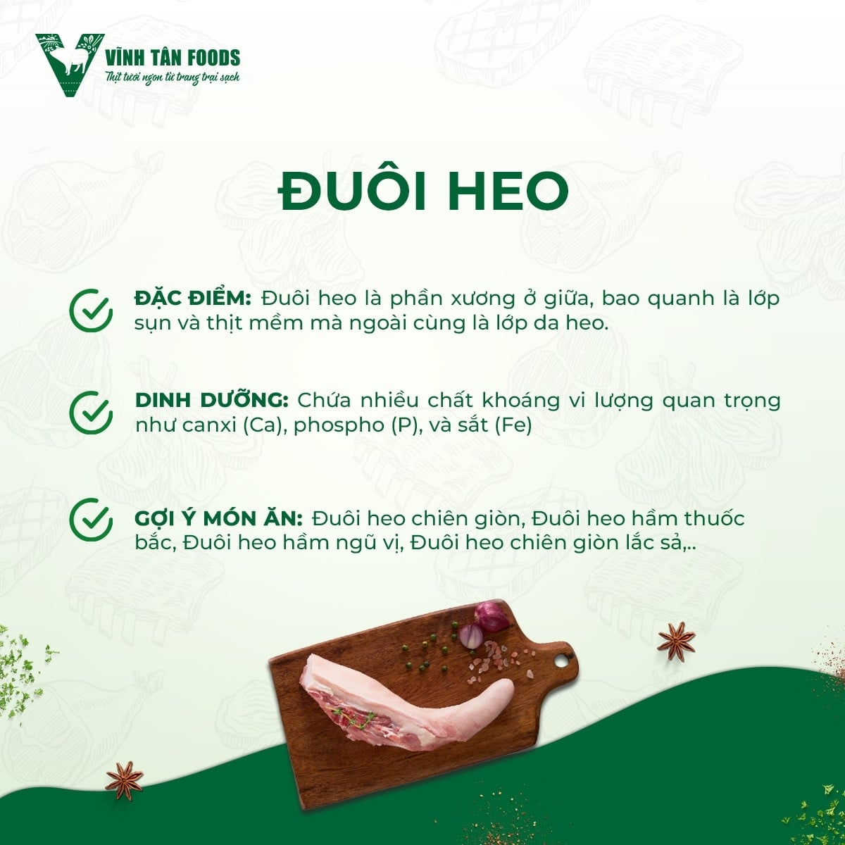 Một chút khéo léo trong chế biến, đuôi heo tươi có thể biến tấu thành nhiều món ăn hấp dẫn, vừa thơm ngon vừa giàu dinh dưỡng cho cả gia đình. Cùng Vĩnh Tân Foods khám phá ngay những món ngon từ đuôi heo để bữa cơm thêm phần đặc sắc nhé!