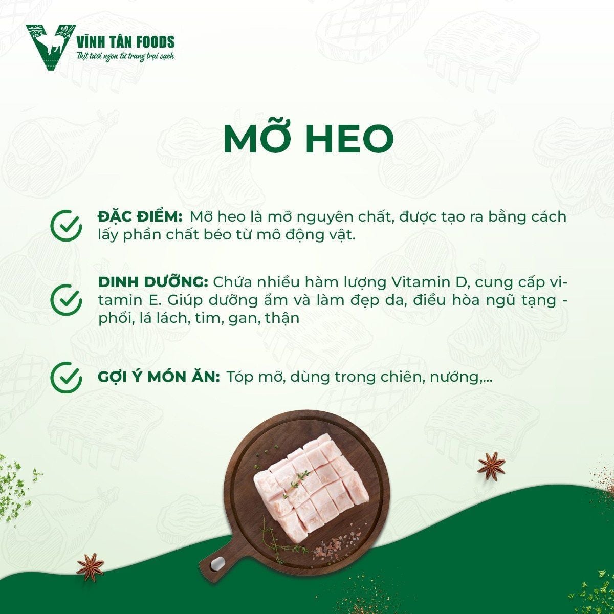 | Mô tả | Mỡ heo là mỡ nguyên chất, được tạo ra bằng cách lấy phần chất béo từ mô động vật. - Chứa nhiều hàm lượng Vitamin D, cung cấp vitamin E - Giúp dưỡng ẩm và làm đẹp da, điều hòa ngũ tạng - phổi, lá lách, tim, gan, thận |
