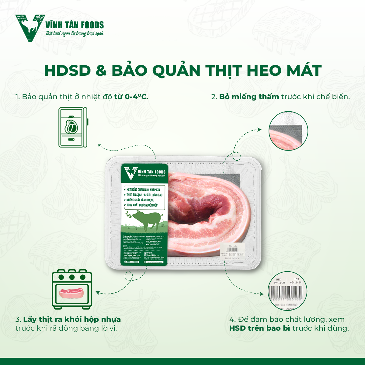 | Bảo quản | Giữ thịt ở nhiệt độ từ 0 – 4 độ C để đảm bảo chất lượng thịt được tốt nhất. Không sử dụng sản phẩm khi hết hạn sử dụng hoặc có dấu hiệu hư hỏng |
